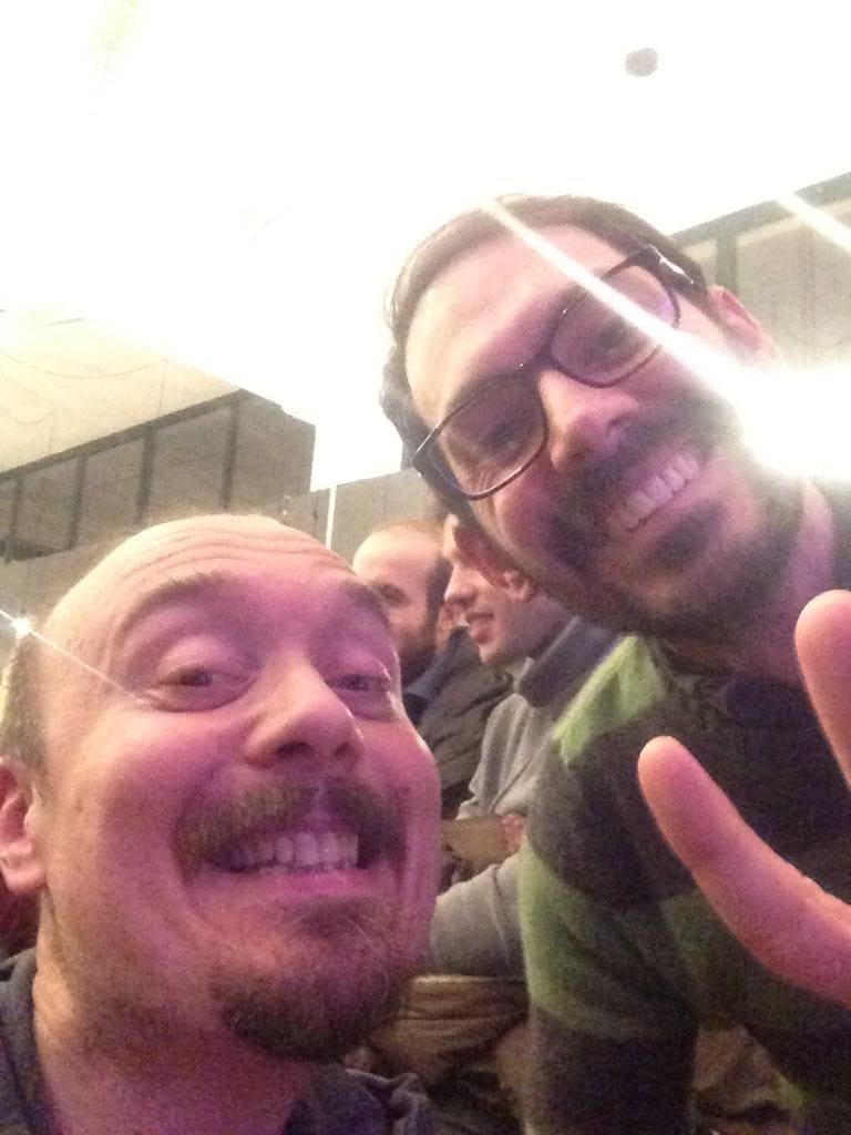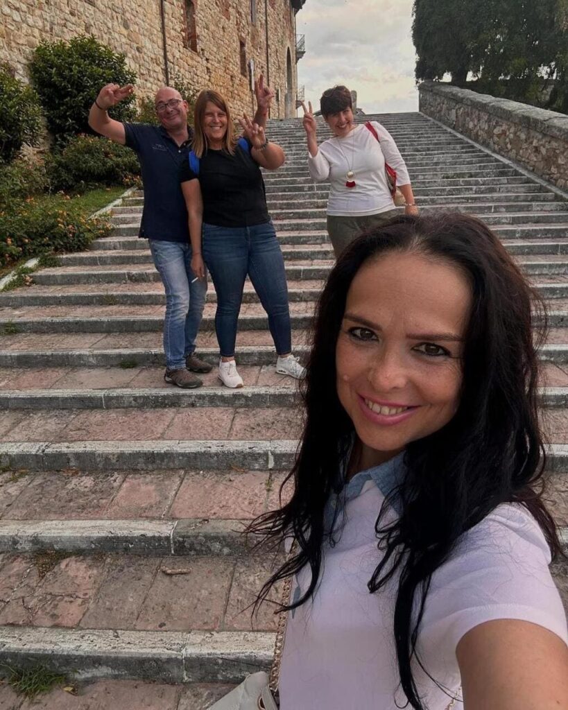 Di questo gruppo fanno parte Chiara, Fabrizio e Manuela, che sono partiti dal mio stesso paese e si sono sobbarcati un’ora e mezza di viaggio per rispondere alla mia convocazione. Con loro c’è la mia compagna Francesca, che io da sempre chiamo Wondy perché è una donna capace di fare mille cose nell’arco di una sola giornata, neanche fosse Wonder Woman – da qui Wondy. Manuela, da vera regina del selfie, documenta tutto con puro talento, immortalando l’incontro con gli altri membri del Banco e con Pino e Melo, che sono a cena con noi.