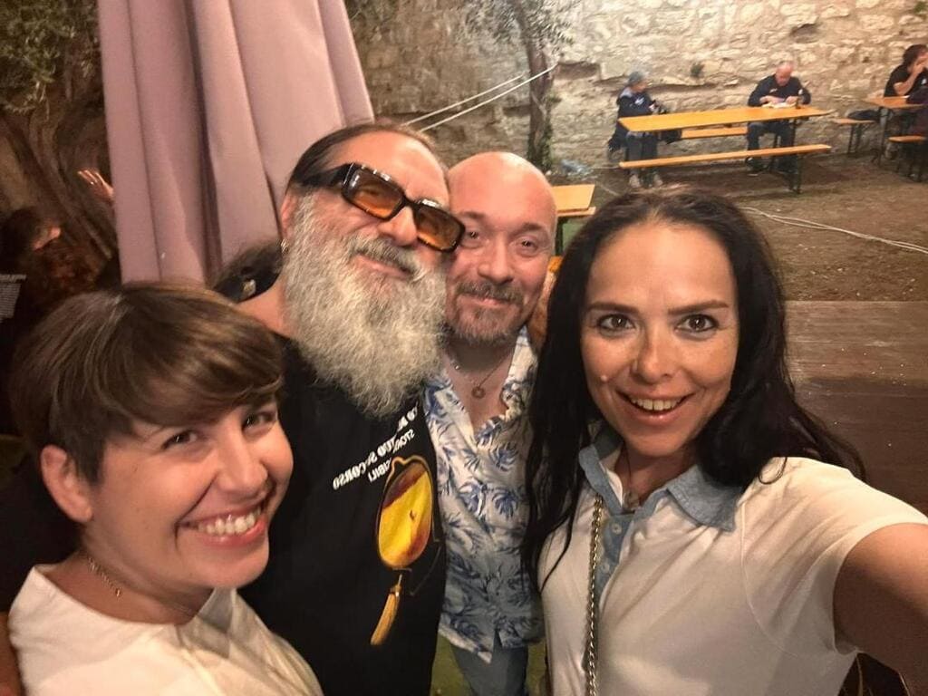 I volontari del festival, dimostrando un affetto di impagabile rarità, hanno cucinato per tutti noi, pensando anche alle mie esigenze vegetariane. Tra il pubblico del Trasimeno Prog e gli artisti viene rimossa ogni barriera psicologica oltreché fisica, così chiunque passi di là è libero di venirci a salutare. Adoro il contatto umano, che a Castiglione del Lago si può respirare a pieni polmoni. Trovo che tutto ciò sia meraviglioso e mi spiace per coloro che, in circostanze simili, hanno preferito la solitudine di un ristorante. Ecco quindi che durante la cena arriva anche un gruppetto speciale, che stavo aspettando da qualche minuto.