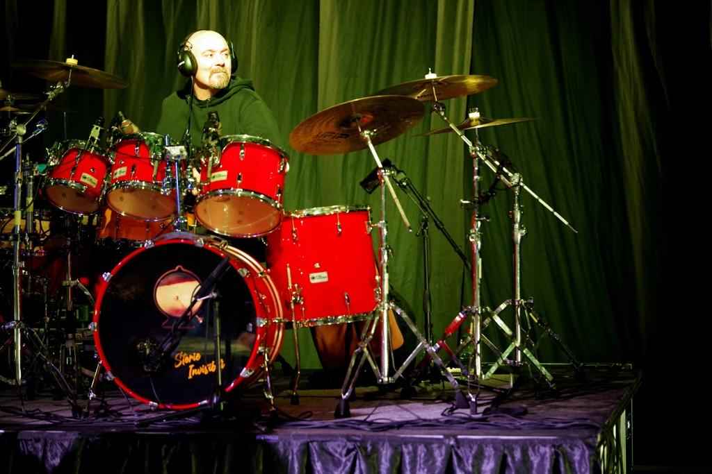 Entriamo all’interno del posto e mi rendo conto che il Geox è uno spazio immenso, ancora più maestoso di come mi appariva dal di fuori. Palco, platea, stanze, stanzine, bagni, zona catering e probabilmente botole segrete. Il posto è incredibile, pulito e gestito con cura dai vari organizzatori, per cui non resta che prendere posto nel nostro camerino. Sul palco scintillano orgogliosi gli strumenti delle tre band e la mia batteria rosseggia al centro della scena, accanto a quella più dark di Michi Dei Rossi, batterista de Le Orme che a breve avrò il piacere di conoscere.