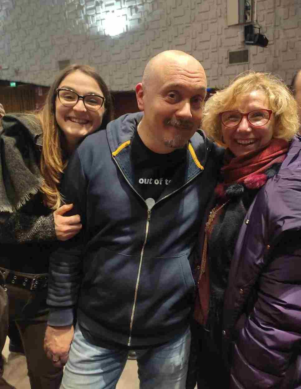 Ed ecco a un tratto materializzarsi una coppia che non poteva mancare: il grande Fabrizio e consorte. I due leggendari fan del Banco, che non incontravo ormai da qualche concerto, sono arrivati con il loro proverbiale anticipo e dopo i classici saluti e i graditi abbracci ci mettiamo a parlare un po’ di tutto, accomodandoci all’interno del teatro e mettendoci a sedere sulla pedana della mia postazione. Il tempo, ancora una volta, scorre piacevolmente e così ecco arrivare gli altri compagni di Banco, a bordo dell’auto di Vittorio. Per ragioni organizzative non è potuto venire Aldo, ma Tony mi ha portato un suo regalo: una maglietta personalizzata che mi piace tantissimo e, incredibile a dirsi, mi sta
