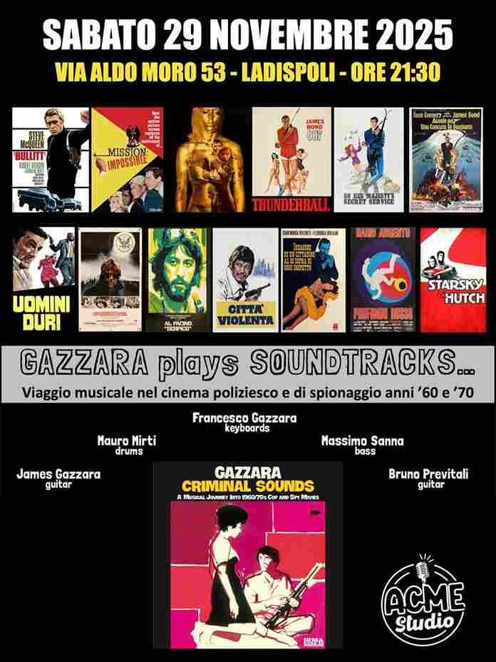 Sabato 29 novembre 2025, alle ore 21.30, presso Acme Studio – Via Aldo Moro 53, Ladispoli, la storica band acid jazz romana, Gazzara , torna per una serata dedicata al suo ultimo progetto, Gazzara plays Soundtracks: Criminal Sounds. L’evento sarà una registrazione live aperta al pubblico. L’ingresso è gratuito e i posti non sono prenotabili: si consiglia di arrivare puntuali alle 21.30 per assistere all’evento.