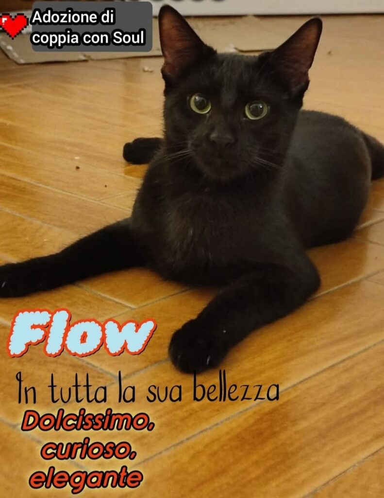 Flow è un po’ timido, attento a ciò che succede intorno, Soul tenerissimo, gatto cozza. Loro mangiano, giocano, dormono, complottano, una coppia perfetta.