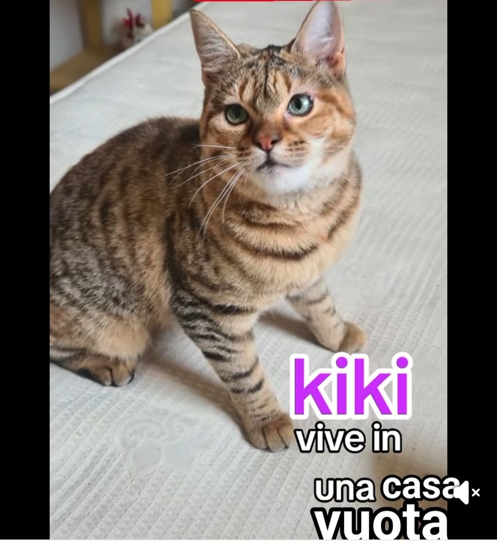 E’ sterilizzata, dolcissima, buona come il pane ma molto triste. Ormai la casa dove sta è vuota, l’hanno lasciata lì da sola. C’è eco, non ci sono passi, non ci sono voci, si sente solo il suo miagolio che ribalza contro i muri freddi. Kiki non chiede nulla…aspetta…Aspetta qualcuno che si prenda cura di lei, che le dica: non sei più sola.