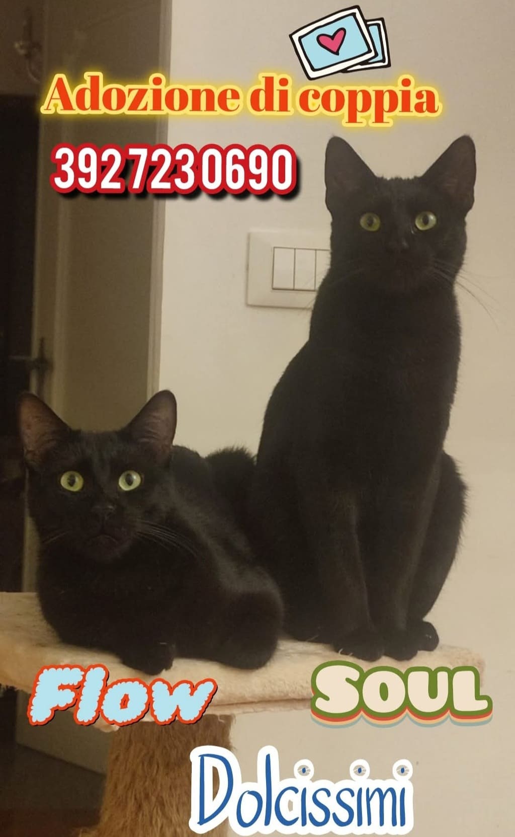 Flow è un po’ timido, attento a ciò che succede intorno, Soul tenerissimo, gatto cozza. Loro mangiano, giocano, dormono, complottano, una coppia perfetta.