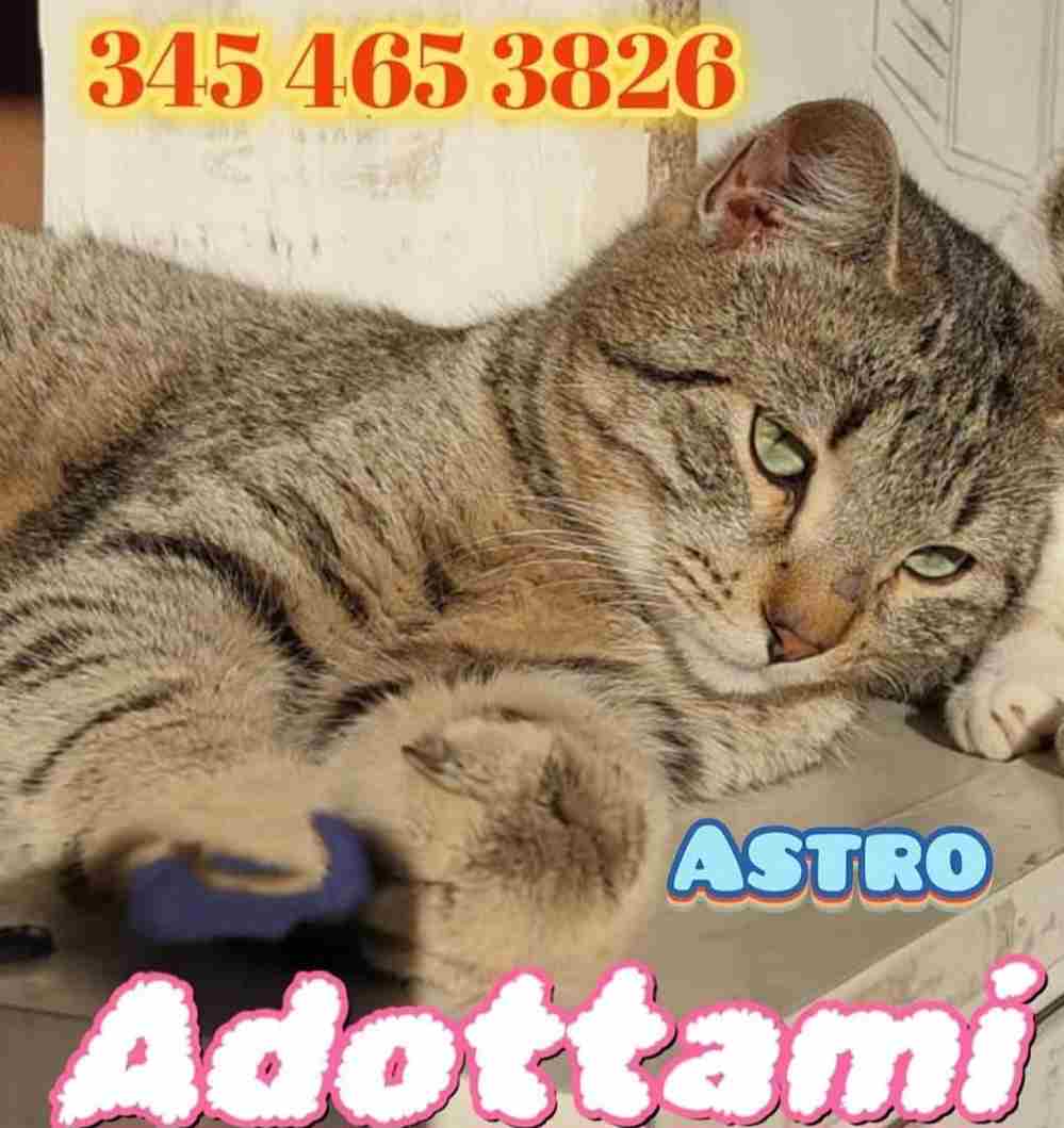 Astro appare rilassato, steso al sole con lo sguardo quieto ma dietro questa apparente tranquillità c’è una vita in pericolo! Vive costantemente nel rischio nonostante la sua aria composta e dolce, come se si fidasse ancora del mondo. E’ un gattino tigrato, elegante, con gli occhi verdi che osservano tutto in silenzio. Astro cerca casa, cerca una famiglia che capisca che lui ha bisogno di protezione, stabilità, affetto. In cambio saprà regalare una compagnia davvero speciale come solo un gatto sa fare.