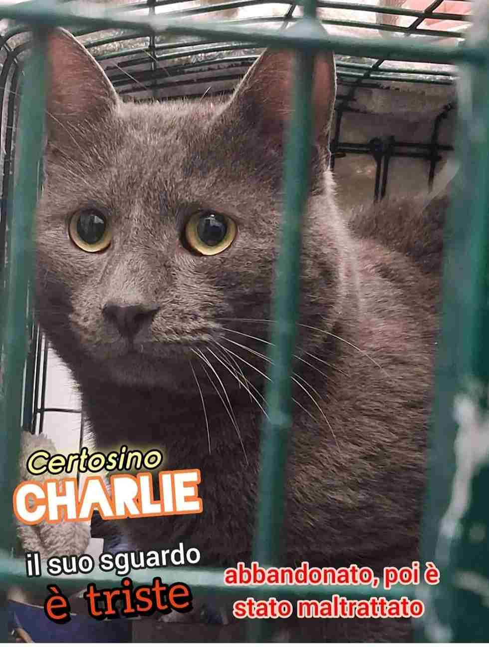 Un gattino, allontanato di malo modo da un ristorante, una vera e propria violenza mai chiarita e una verità che probabilmente non verrà mai a galla. Oggi Charlie è stato recuperato . Charlie ha bisogno di coccole, di una casa, di qualcuno che gli faccia dimenticare che gli umani a volte possono fare molto male. Ha bisogno di qualcuno che gli sussurri: Non succederà più! Charlie non chiede nulla oltre che amore.