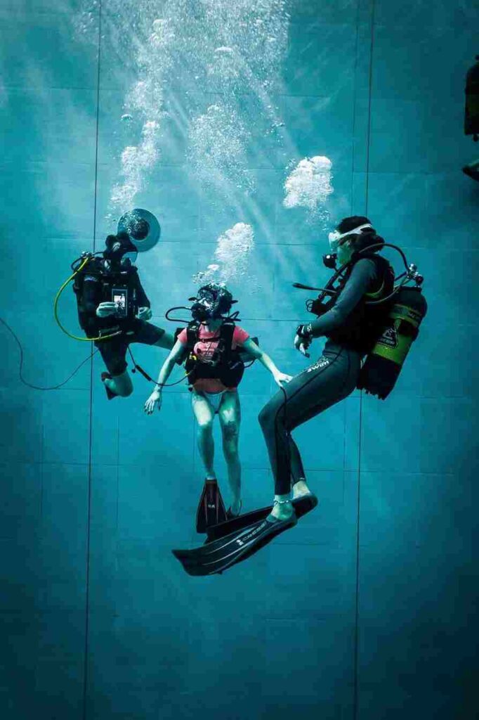 La vocalist, già modella incoronata Miss Veneto 2020, è potuta scendere con l’istruttrice di subacquea di Y-40 Giada Scarpa fino ai -12 metri, la massima profondità per chi non ha ancora conseguito un brevetto. Si è divertita in sicurezza nei grandi spazi della struttura e intorno al ponte sommerso a -5 metri. Da li la osservavano alcuni spettatori incuriositi, tra cui il dj Marco Cavax.