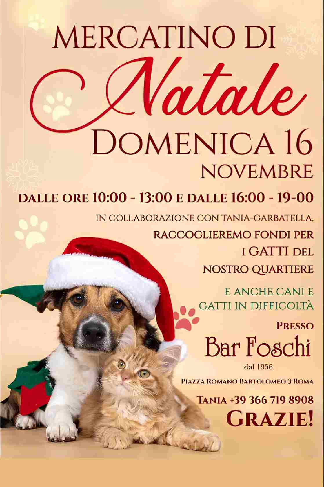 Il mercatino solidale si terrà dunque domenica 16 novembre al Bar Foschi, nel cuore della Garbatella. Tra i banchetti si potranno trovare oggetti fatti a mano, piccoli regali, decorazioni natalizie e tante idee solidali. Tutto il ricavato sarà destinato alle colonie feline del quartiere e ai rifugi che ospitano cani e gatti in difficoltà.