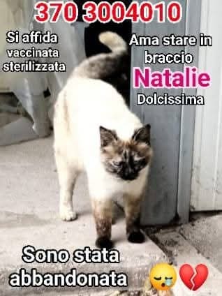 Si trova in strada. URGENTE! Natalie è dolcissima, ama stare in braccio e oggi non ha più una famiglia, dorme in stradasu gelide buste di plastica, per terra. Aiutaci a trovarle una casa, dove tornare a fare le fusa, a ricevere carezzine. Natalie si affida in provincia di Roma, sterilizzata e testata. Facciamole un regalino, il più bello: una famiglia VERA.