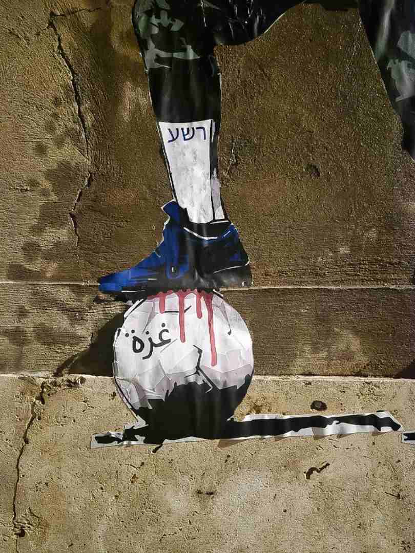 L’opera, intitolata “The Bloody Match”, raffigura un calciatore-soldato con la maglia della nazionale israeliana e il numero 67. È un chiaro riferimento ai 67.000 palestinesi uccisi nel conflitto a Gaza. Il giocatore imbraccia un fucile e schiaccia con il piede un pallone insanguinato, su cui campeggia la scritta “Gaza”.