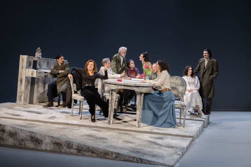 La scena è ridotta a pochi elementi essenziali: tavoli, sedie, un pianoforte. Nessun naturalismo, nessuna Russia riconoscibile. Lo spazio sembra piuttosto una zona sospesa, un luogo mentale in cui i personaggi si muovono come sopravvissuti di qualcosa che non viene mai esplicitato.