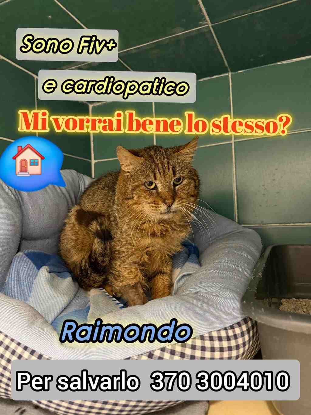 Raimondo ora è in clinica spaesato, fragile, malato. È FIV positivo e cardiopatico. Ha bisogno di cure, di attenzioni, di qualcuno che sappia dargli le sue medicine… ma soprattutto ha bisogno di amore vero, quello che non ha mai avuto davvero.